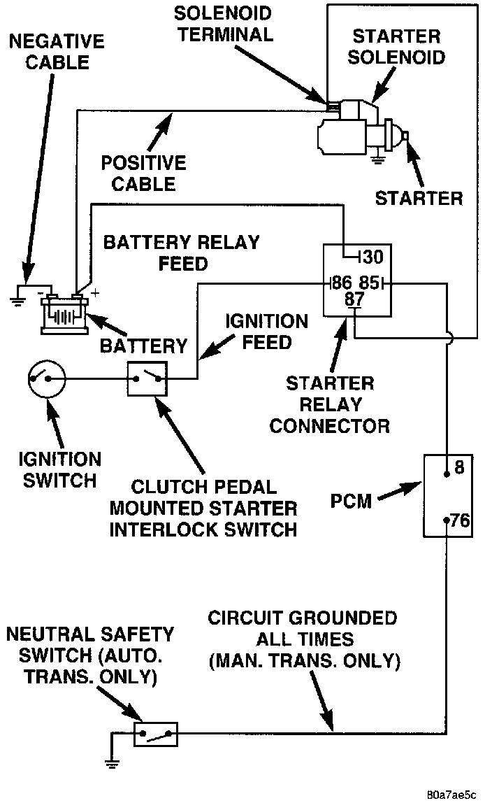 5. The coil ground terminal (85) is connected to the electromagnet in the relay. On vehicles with an automatic transmission, it is grounded through the park/neutral position switch only when the gearshift selector lever is in the Park or Neutral positions. On vehicles with a manual transmission, it is grounded at all times. Check for continuity to ground at the cavity for relay terminal 85. If not OK with an automatic transmission, check for an open or short circuit to the park/neutral position switch and repair, if required. If the circuit is OK, see the Park/Neutral Position Switch Test procedure in this section. If not OK with a manual transmission, repair the circuit to ground as required.