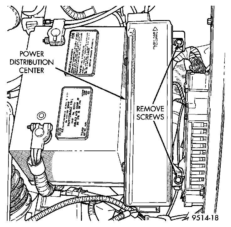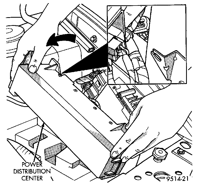 7. Pull PDC rearward to remove from front bracket. Lay PDC aside to allow access to Powertrain Control Module (PCM).
