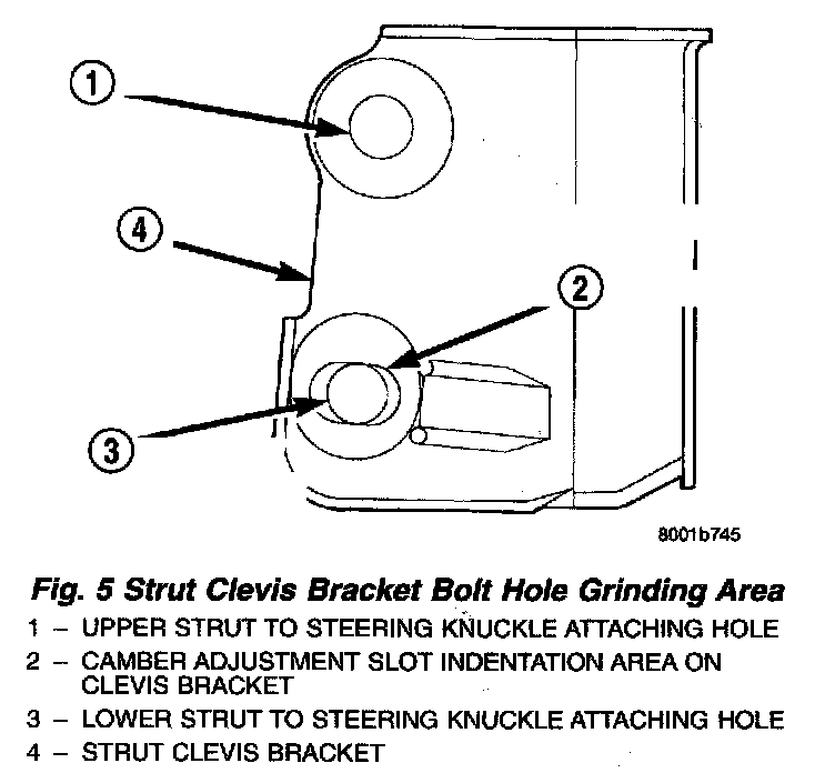 Caution: After slotting the strut clevis bracket hole, do not install the original attaching bolts when assembling the steering knuckle to the strut assembly. Only the flange bolts, cam bolts, and dog bone washers from the service package must be used to attach the steering knuckle to the strut after the mounting hole is slotted.