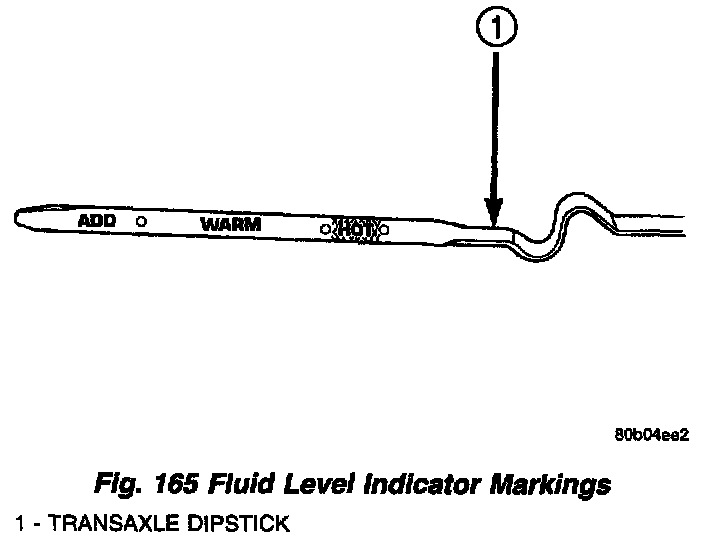 The torque converter fills in both the P Park and N Neutral positions. Place the selector lever in P Park to be sure that the fluid level check is accurate. The engine should be running at idle speed for at least one minute, with the vehicle on level ground. This will assure complete oil level stabilization between differential and transmission. The fluid should be at normal operating temperature (approximately 82°C or 180°F.). The fluid level is correct if it is in the HOT region (crosshatched area) on the fluid level indicator (Fig. 165).
