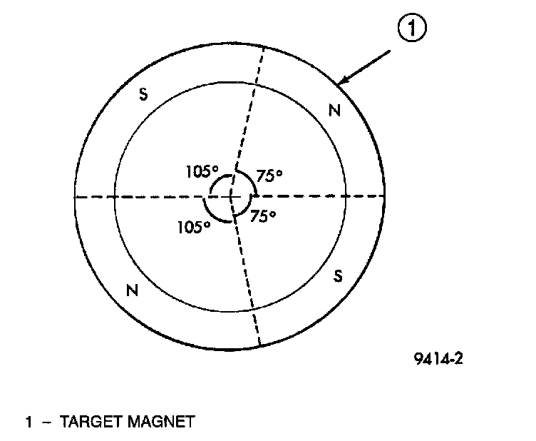 The target magnet has four different poles arranged in an asymmetrical pattern. As the target magnet rotates, the Camshaft Position Sensor senses the change in polarity. The sensor output switch switches from high (5.0 volts) to low (0.30 volts) as the target magnet rotates. When the north pole of the target magnet passes under the sensor, the output switches high. The sensor output switches low when the south pole of the target magnet passes underneath.