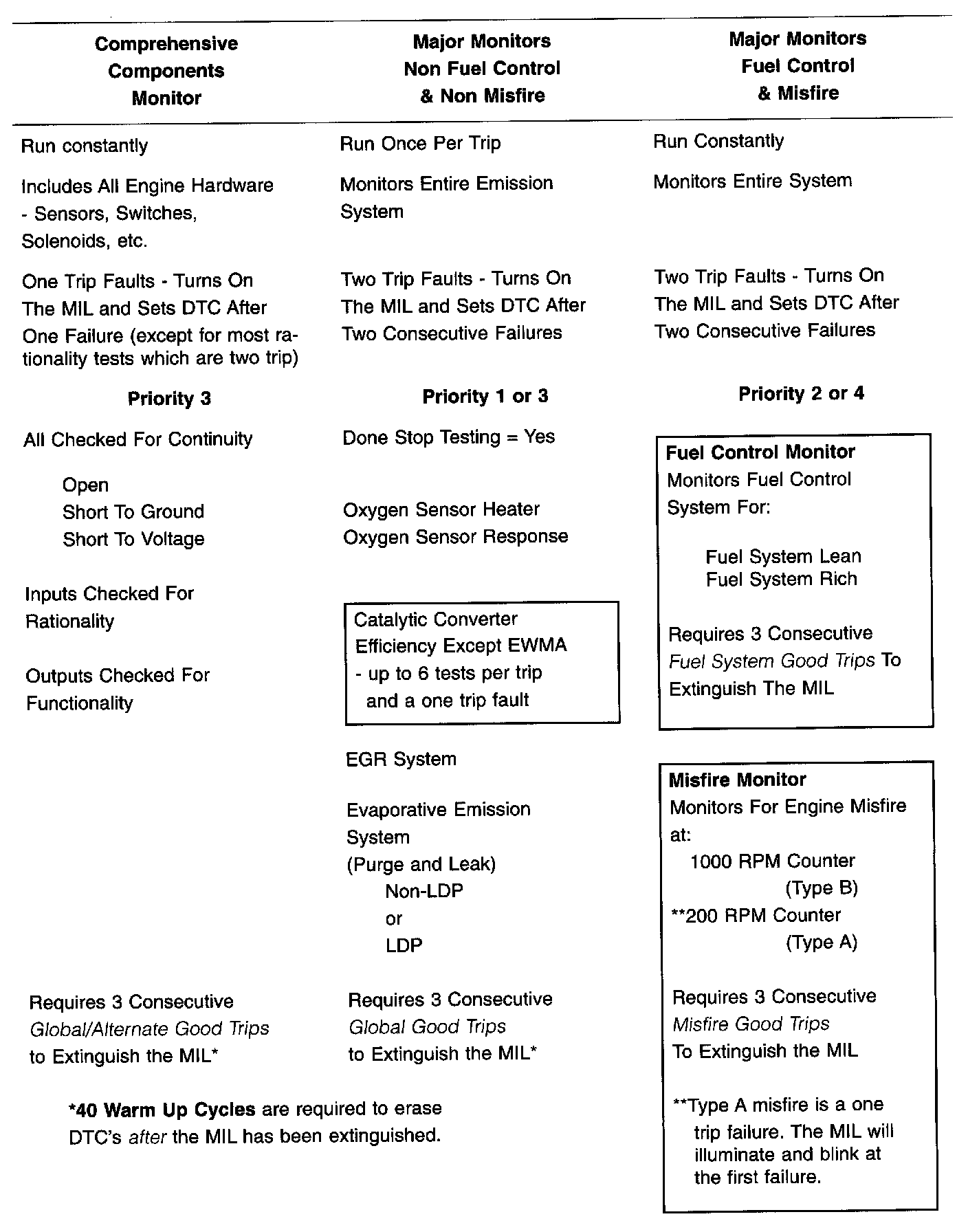 The table summarizes the various OBD II monitors operation.