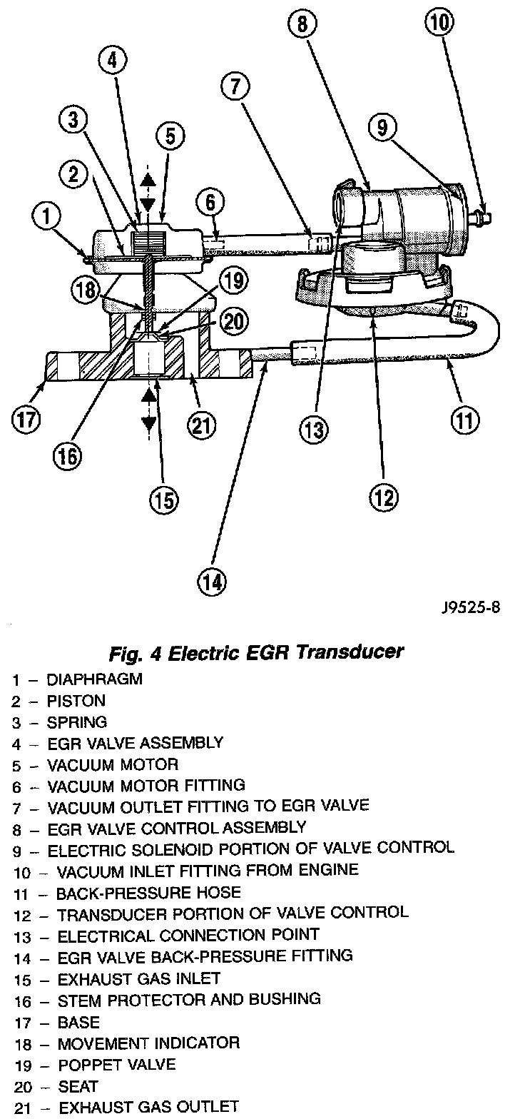 The electric EGR transducer contains an electrically operated solenoid and a back-pressure transducer. The Powertrain Control Module (PCM) operates the solenoid. The PCM determines when to energize the solenoid. Exhaust system back-pressure controls the transducer.