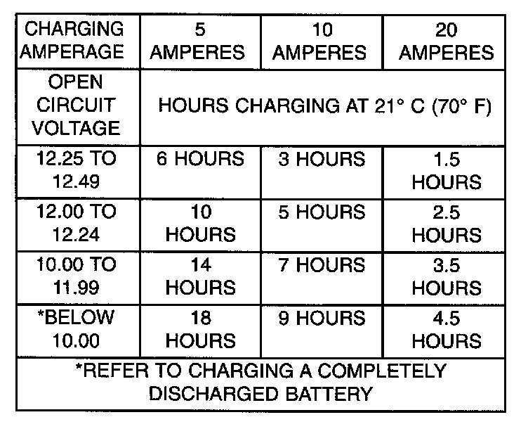 A completely discharged large heavy-duty battery may require more recharging time than a completely discharged small capacity battery, refer to the Battery Charging Timetable for charging times.