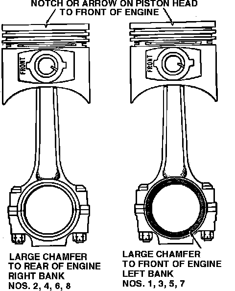 When installing piston and rod assemblies in the cylinders, the compression ring gaps should be diametrically opposite one another and not in line with the oil ring gap. The oil ring expander gap should be toward the outside of the ``V'' of the engine. The oil ring gap should be turned toward the inside of the engine ``V.''