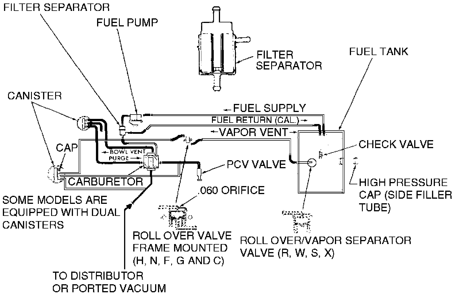 Evaporated fuel vapor from the fuel tank flows through the separator to the canister. The canister used has three hoses and no purge valve. The purge valve previously located on top of the canister has been eliminated by using an additional ported vacuum connection on the carburetor for purging the canister.