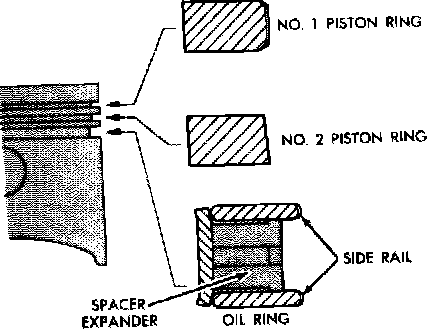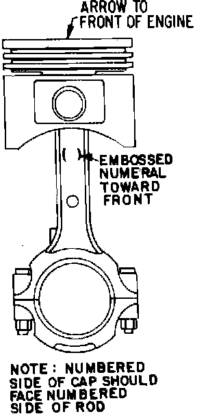 During installation of piston and rod assembly, arrow at top of piston must face toward front of engine (timing chain), Fig. 17. Refer to Fig. 18 for correct piston ring installation and note following groove clearances: