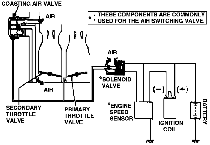 The coasting air valve system and air switching valve system are used to reduce HC emissions during deceleration. The engine speed sensor which controls the solenoid valve, will prevent the coasting air valve or air switching valve from operating at or below a specified engine RPM, by opening the solenoid valve. On 1,400, 1,600 and 2,000cc engines, the specified engine speed is 1800 RPM (± 200 RPM). On 2,600cc engines, the specified engine speed is 1600 RPM (± 200 RPM). This is done to prevent poor idling or engine stalling at lower engine speeds. The coasting air valve supplies additional air to the intake manifold at engine speeds within the specified range, from a port located below the secondary throttle valve. The air switching valve supplies additional air to the intake manifold at engine speeds within the specified range, from the idle mixture adjusting screw passage located below the primary throttle valve. The coasting air valve and air switching valve are built into the carburetor.