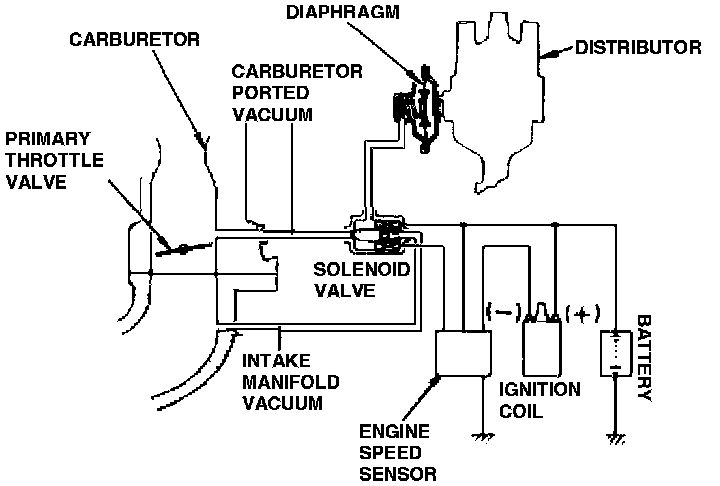 On 1981-82 models the deceleration spark advance system, consists of an engine speed sensor and a solenoid valve, Fig. 20. During deceleration, ignition timing is advanced by intake manifold vacuum acting upon the distributor vacuum advance unit diaphragm, which is routed through the solenoid valve. At or below a specified engine RPM, the engine speed sensor will activate the solenoid valve, changing vacuum acting upon the distributor vacuum advance unit diaphragm from intake manifold vacuum to carburetor ported vacuum.