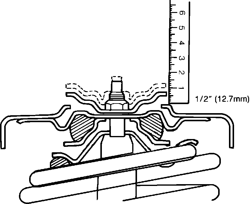 3. Lower the vehicle completely to the floor with the vehicle weight on all four wheels. Again measure the distance between the strut rebound retainer and the strut mount in the same location as in Step 2.