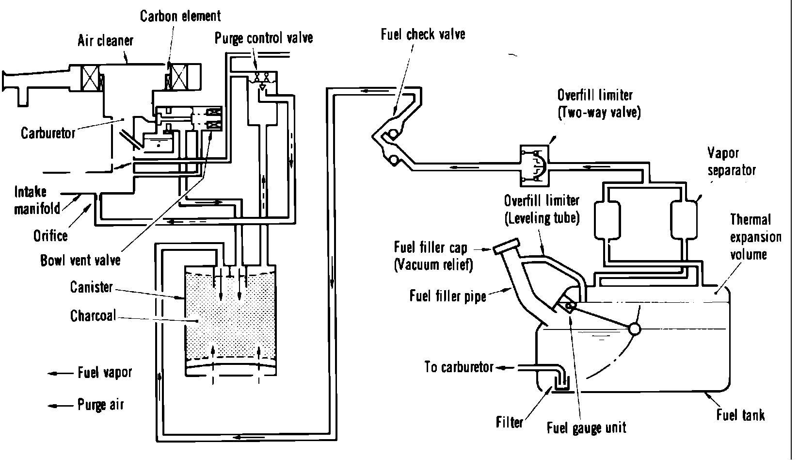 The system consists basically of carbon canister(s), a bowl vent valve, a purge control valve, a carbon element, a thermo valve, a vapor separator, a pressure relief fuel filler cap, an overfill limiter and a fuel check valve.