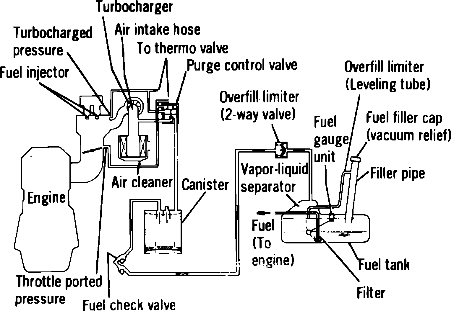 Fig. 21 Evaporative emission system. Turbocharged models (typical):