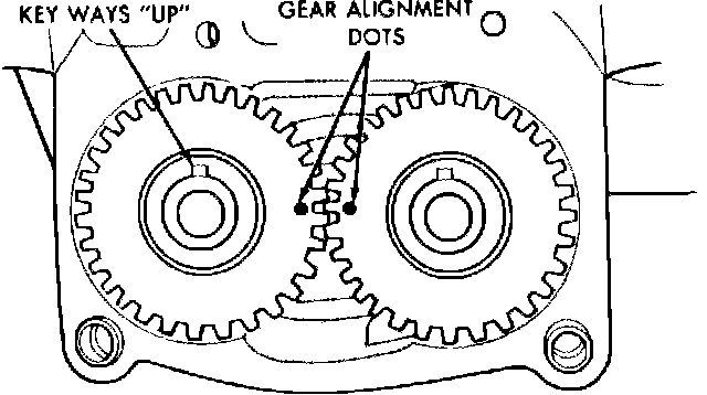 2. Rotate balance shafts until both shaft keyways are parallel to vertical centerline of engine, then install short hub drive gear on sprocket driven shaft. After installation, gear and balance shaft keyways must face up with gear timing marks meshed as shown, Fig. 24.