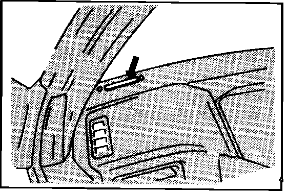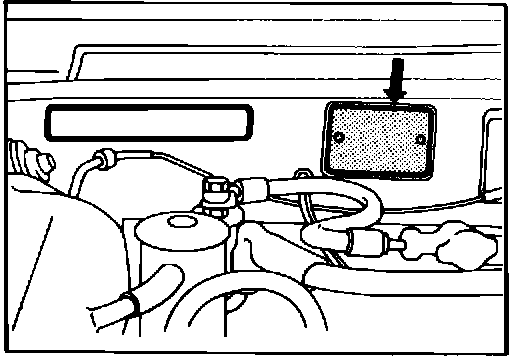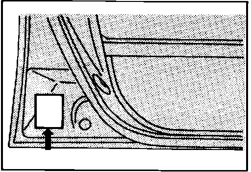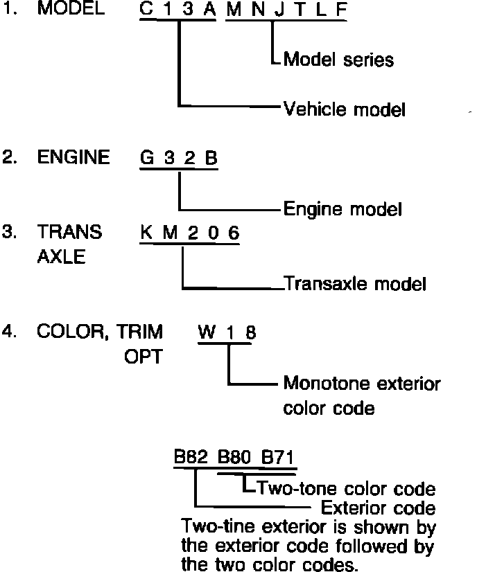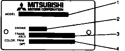 Vehicle information code plate is riveted onto the bulkhead in the engine compartment. The plate shows model code, engine model, transaxle model, and body color code.
