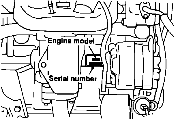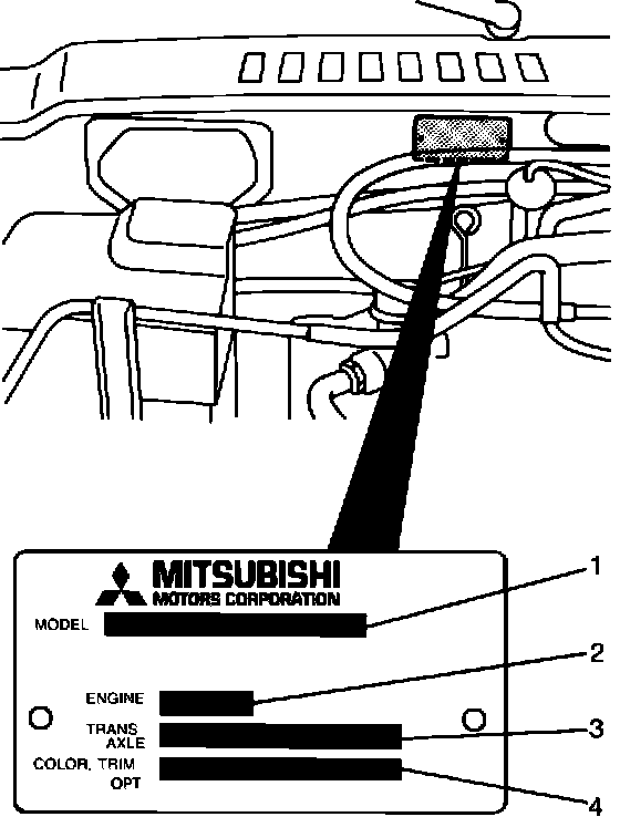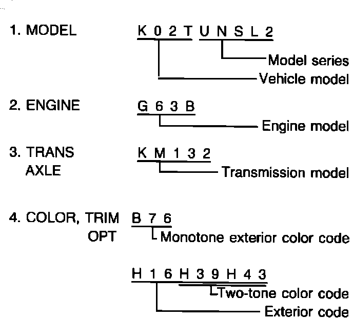 Vehicle information code, plate is riveted on the cowl panel in the engine compartment. The plate shows model code, engine model, transmission model, and body code.