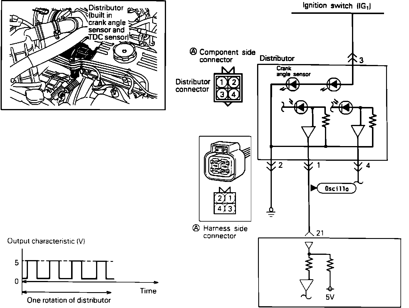 1. Connect test leads from the oscilloscope to the 1 terminal of the distributor connector and run the engine at idle speed.