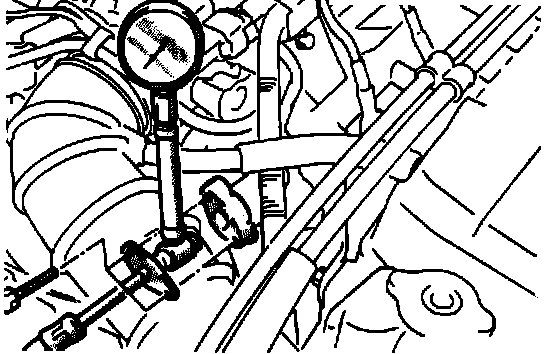 9. Stop the engine and check for a change in fuel pressure readings. Pressure should hold for 5 minutes. If the gauge reading drops, observe the rate of drop. Determine the cause according to the following symptoms.