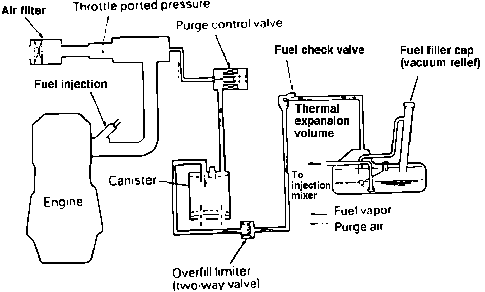 The Evaporative Emission Control System is designed to prevent fuel vapors from being emitted into the atmosphere from the fuel system. The Evaporative Emission Control System consists of a Pressure/Vacuum Relief Filler Cap, an Overfill Limiter (Two-way Valve), Rollover Safety Check Valves, a Charcoal Canister, and connecting lines and hoses. Canister purging is controlled by the MPI Control Unit through a Purge Control Solenoid Valve.