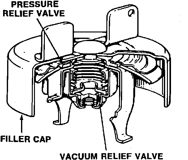 The pressure-vacuum filler cap is designed to hold a slight pressure on the fuel which occurs from normal heat expansion. The evaporation rate decreases under slightly higher pressures, so the cap helps to reduce evaporative emissions. When vacuum in the tank exceeds specifications, the vacuum relief portion of the filler cap will allow atmospheric pressure to enter the tank. If the pressure within the tank exceeds a specified value, the pressure relief valve will open to relieve excess pressure. This would occur when the Two-way Valve within the fuel vapor line became plugged.