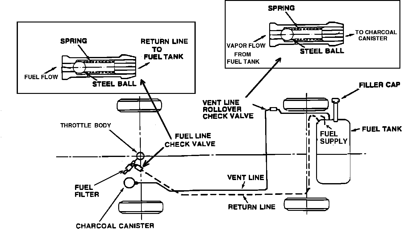 A rollover check valve is installed within the fuel line between the fuel tank and the fuel injectors. Its primary purposes is to seal off the fuel tank in the event of an accidental vehicle rollover. The pressure relief check valve is located within the vapor line between the fuel tank and the charcoal canister. It is designed to vent excess pressure and fuel vapors from the tank into the charcoal canister, when the fuel tank pressure becomes positive and reaches a specified value, as well as to seal the fuel tank in the event of an accidental rollover.