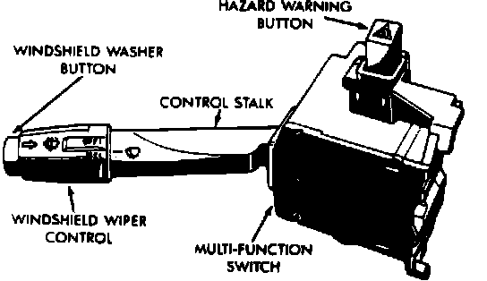 The multi-function switch contains electrical circuitry for turn signal, cornering lamps, hazard warning, headlamp dimmer, windshield wiper, pulse wipe and windshield washer switching. This switch is mounted to the lefthand side of the steering column. Should any function of the switch fail, the entire switch assembly must be replaced.