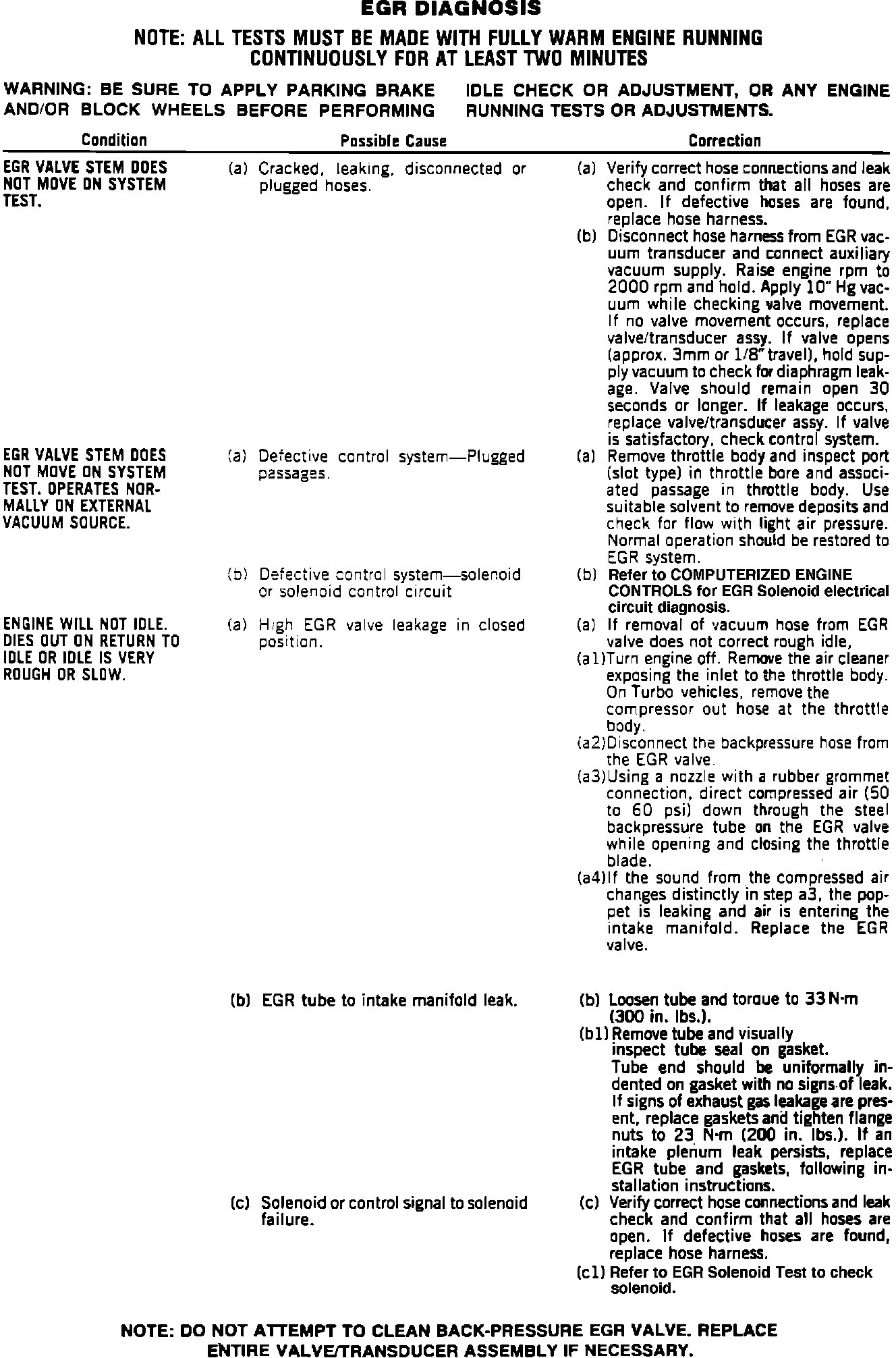 7. If engine rpm does not drop when vacuum is applied to the EGR vacuum diaphragm, then a defective EGR valve or plugged EGR passage, or tube is indicated. The EGR valve, intake manifold passage, and tube assembly should be removed, inspected, and cleaned or replaced. Refer to MAINTENANCE PROCEDURES for cleaning and inspection procedures for the EGR valve and passages.