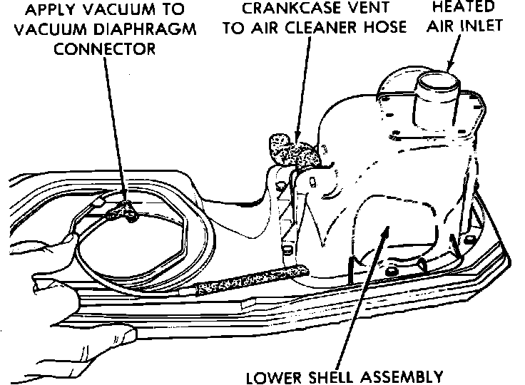 4. Remove air cleaner from engine and allow engine to cool down to 115°F. Using a suitable vacuum pump, apply 20 inches Hg vacuum to the sensor. The door should be in the up (heat on) position. If not, check vacuum diaphragm.
