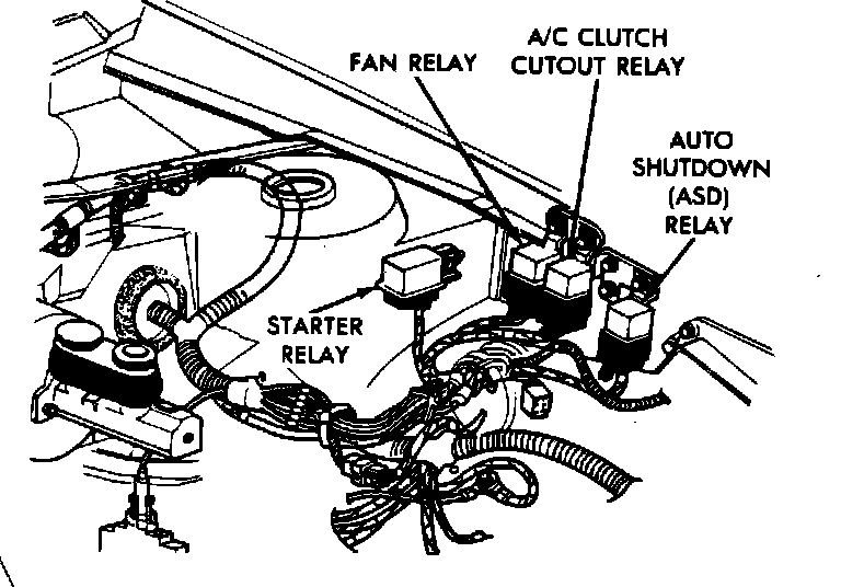 This relay is controlled by the A/C switch (inside vehicle) and the Single Board Engine Controller (SBEC), and it is supplied power by the radiator fan relay. It is in the ENERGIZED (ON) position when the engine is RUNNING, blower motor switch in the ON position, and the A/C control switch is CLOSED.