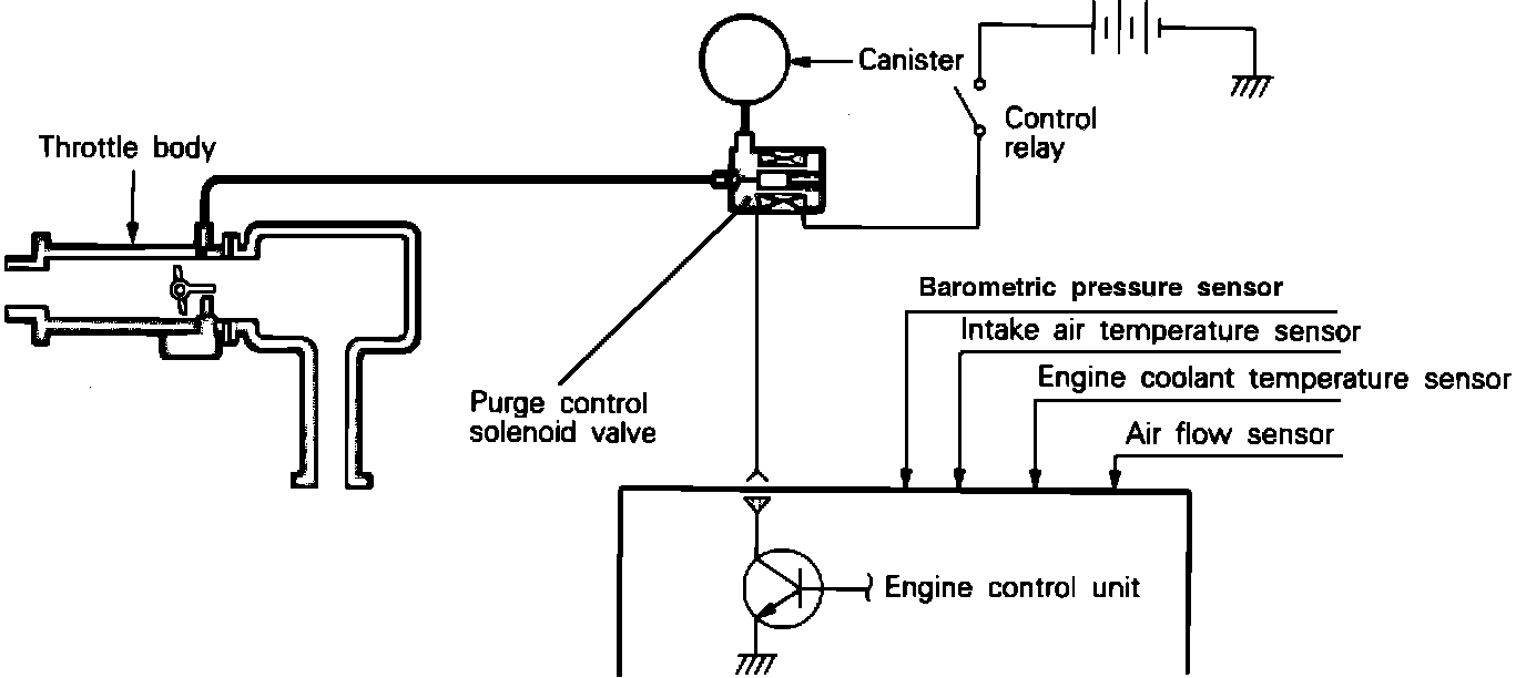 When the ECU senses the correct conditions for operation, it supplies the ground circuit to the solenoid. This opens the solenoid, allowing manifold vacuum to be applied to the carbon canister, allowing fresh air is to be drawn into the bottom of the canister.