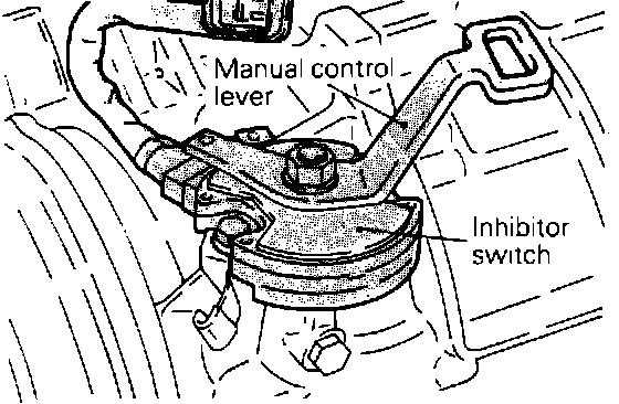 2. Remove the lock nut from the control shaft and pull the control lever from the inhibitor switch.