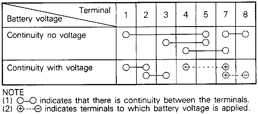 Check for continuity between terminals under the conditions described in the chart below.