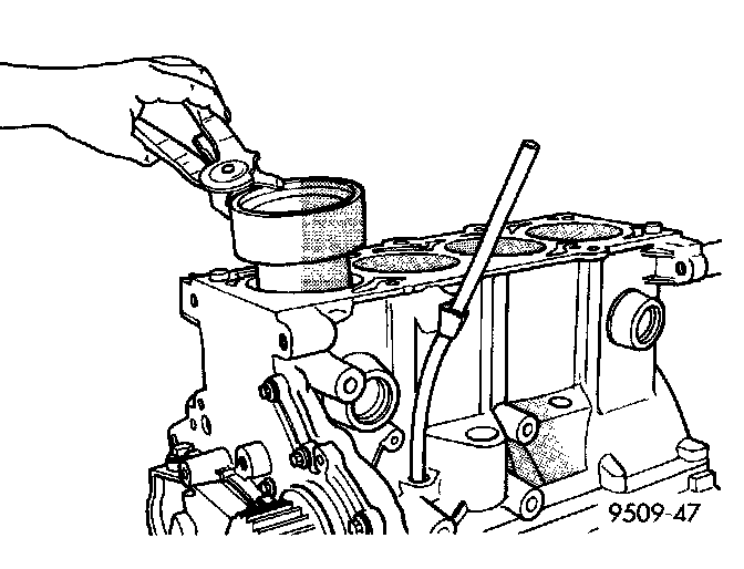 6. Tap the piston down in cylinder bore, using a hammer handle. At the same time, guide connecting rod into position on connecting rod journal.
