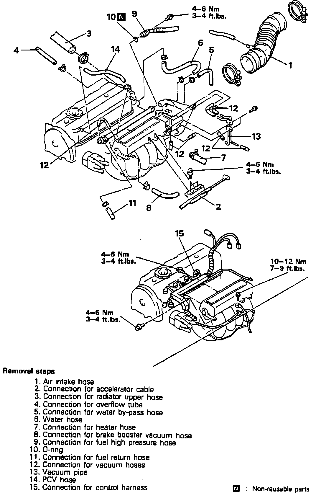 Remove intake manifold in numbered sequence, referring to Fig. 10 on 1.8L/4-107 engines and Fig. 11 on 2.0L/4-122 engines, noting the following: