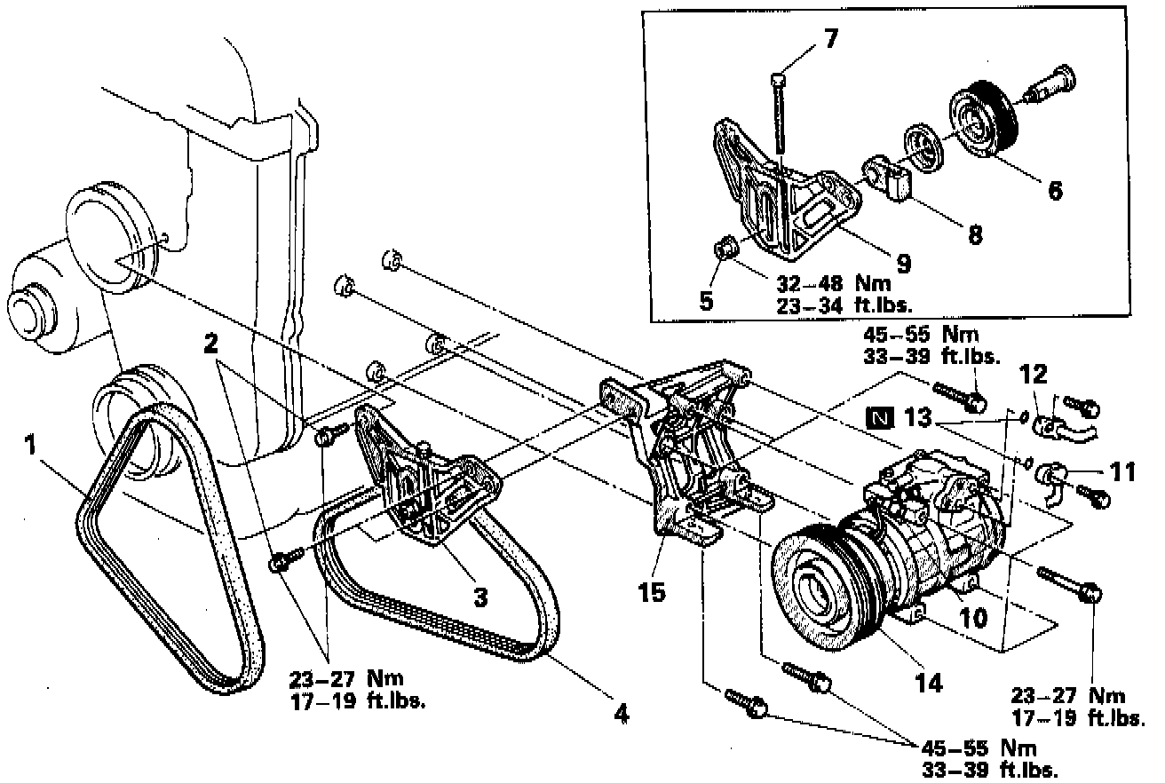 Attach the compressor drive belt to the crankshaft pulley and the compressor's pulley, and then install the tension pulley assembly.