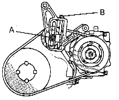 1. After loosening nut A (for holding the tension pulley), loosen bolt B (for adjustment) and reduce the tension of the compressor drive belt to zero.