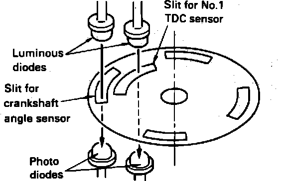 The four slits located at the outer circumference of the disc serve to detect the position of the crankshaft (and, therefore, the piston) relative to top dead center. The ECM, based on this signal, determines the fuel injection timing, and also calculates the amount of intake-air, the timing of the ignition signal, etc. for each revolution of the engine.