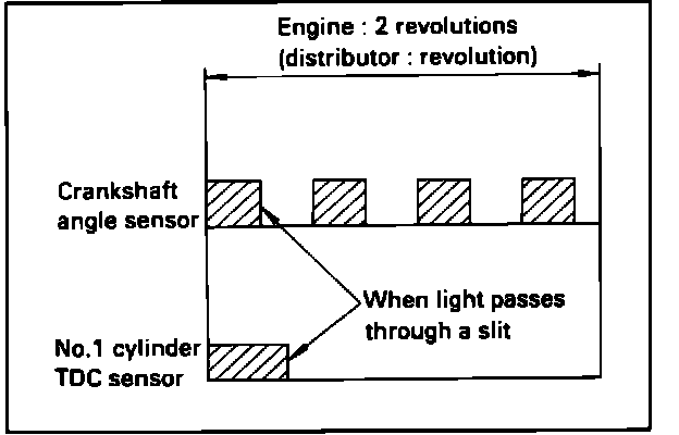 Top dead center is detected by the signal obtained through the one inner slit of the disc. The ECM, based upon this signal, determines which of the four pulses from crank angle sensor is the signal for the #1 cylinder.