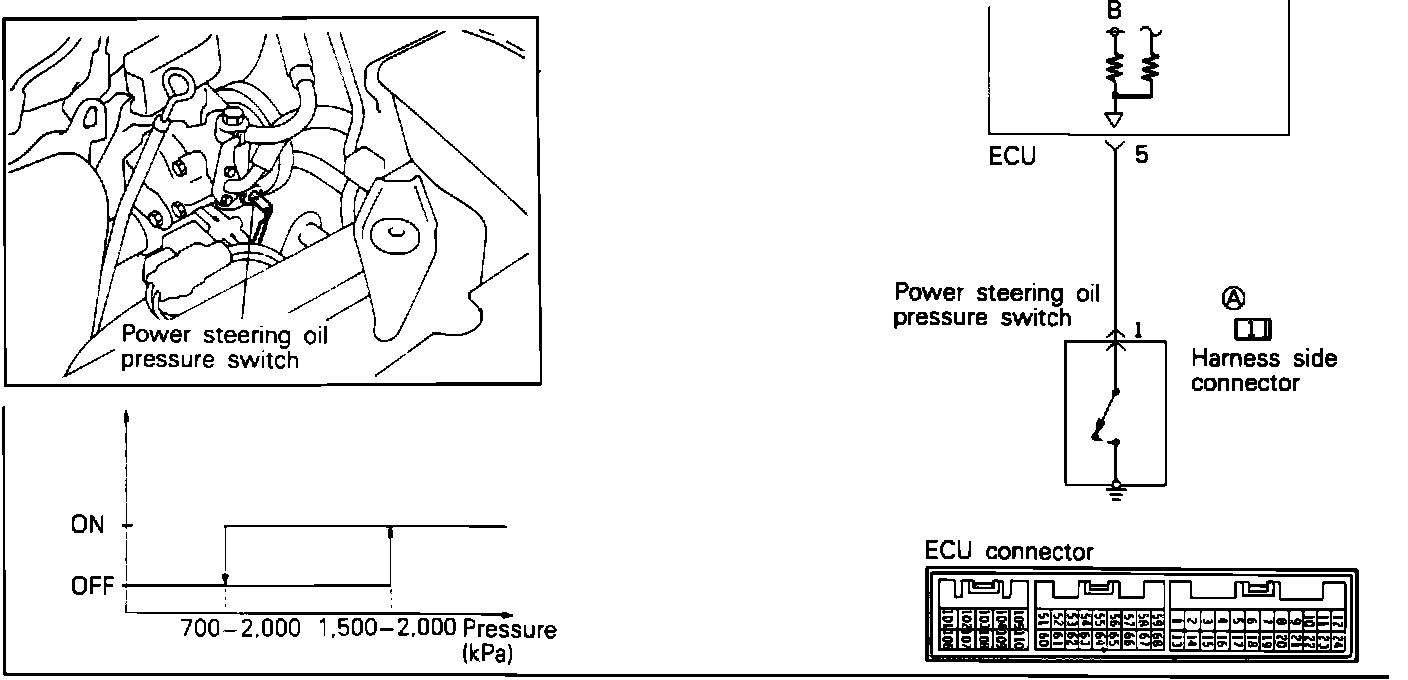The Power Steering load switch provides a signal to the ECU when there is steering load. The ECU uses this information for idle speed control. When pump output pressure exceeds a preset level, the switch closes, completing the circuit to ground.