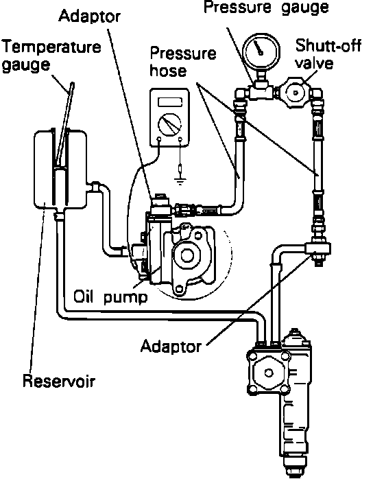 2. Install the pressure gauge with a shut-off valve between the oil pump and the disconnected hose.