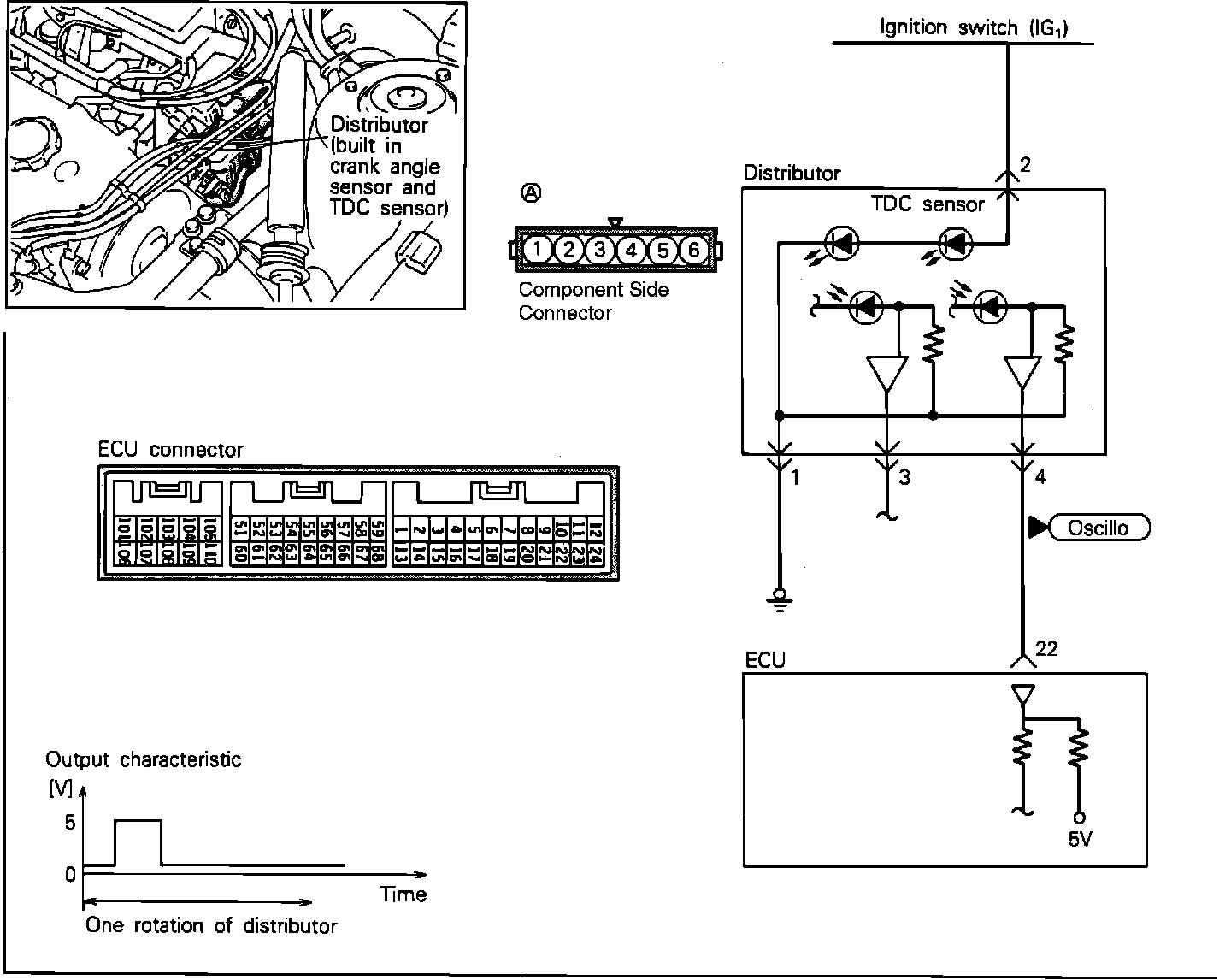 1. Connect test leads from the oscilloscope to the #4 terminal of the sensor connector and run the engine at idle speed.