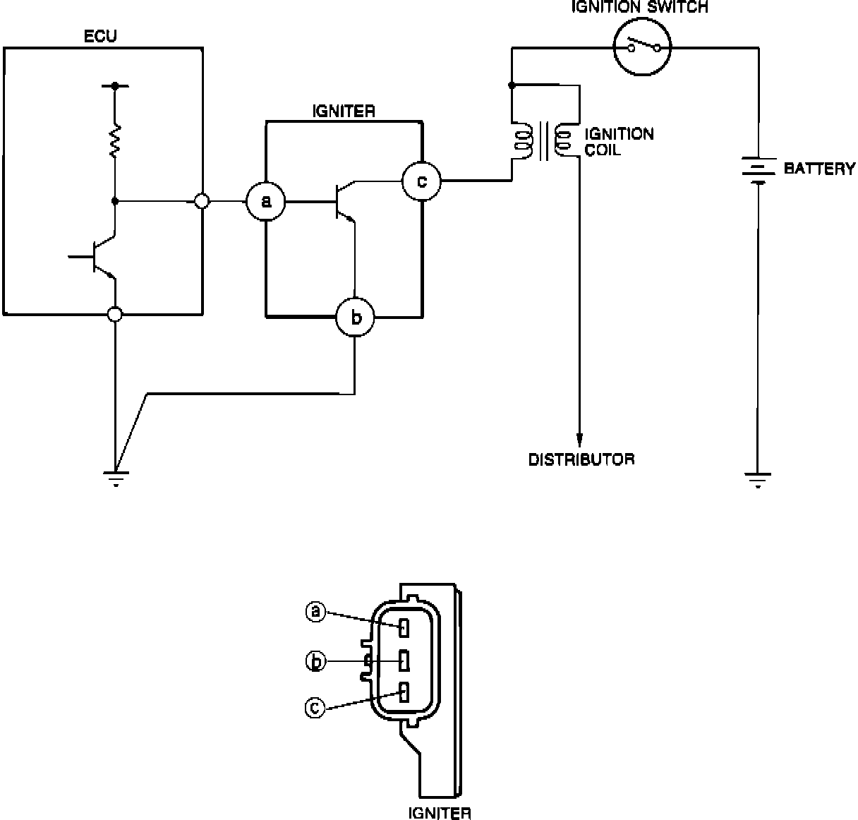 An ECU controlled power transistor is used as a switch to regulate current flow through the coil primary circuit. Each time current flow is interrupted, high voltage is induced to fire the spark plugs. Except for the initial setting, timing is determined by the ECU.