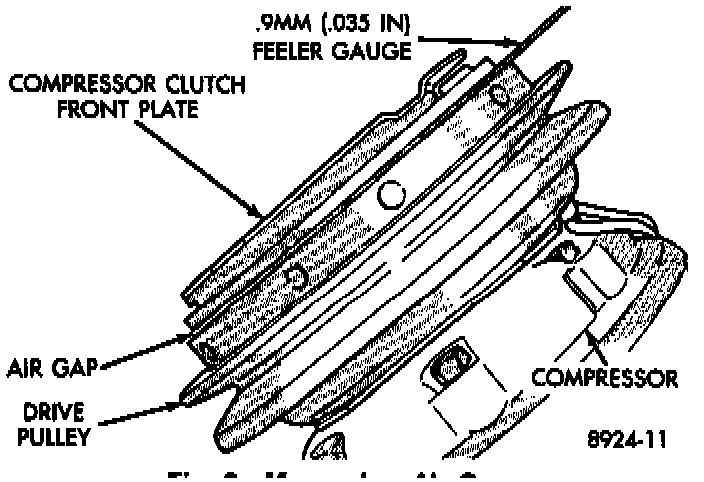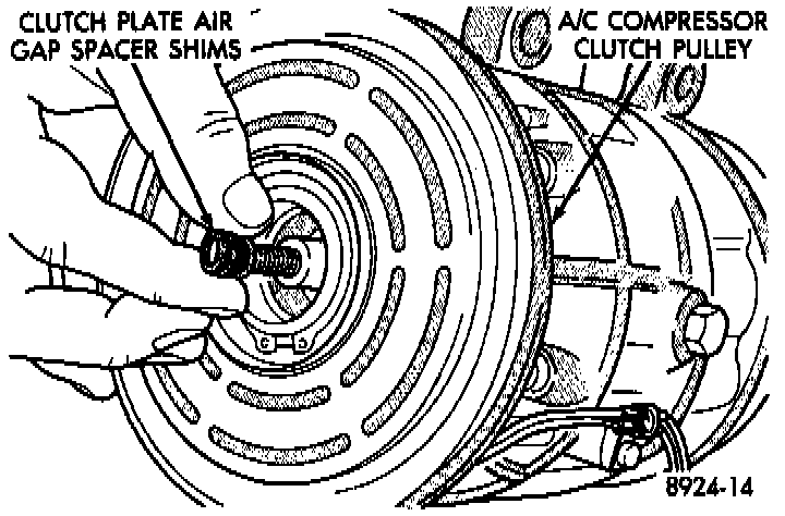 3. Using a suitable puller, remove the clutch front plate from the assembly. When installing the front plate, select the proper shims to achieve a 0.9mm (0.035 in.) air gap to the pulley surface. To install front plate, align shaft key to groove in front plate hub and push on until it seats, measure the air gap.