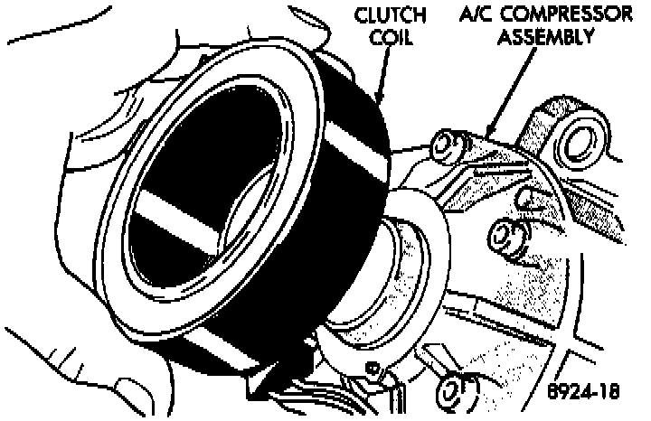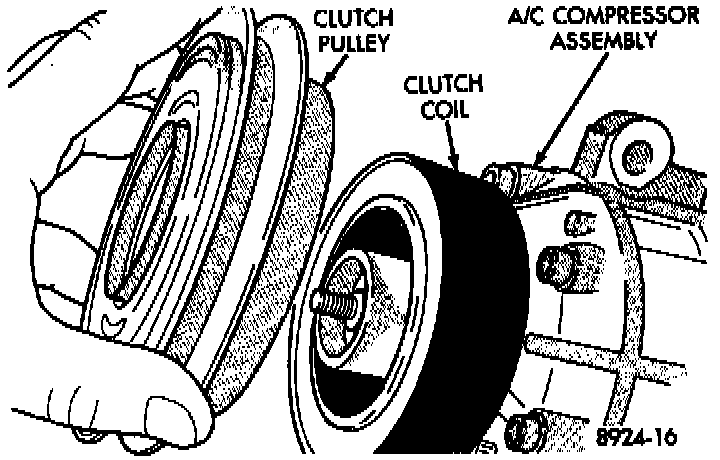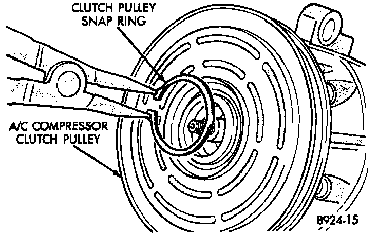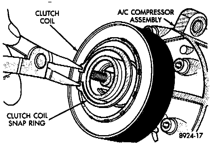 6. Remove clutch coil retaining snap ring and pull the coil from the assembly. When installing the clutch coil, align the pin on the front of the compressor to the middle hole in the hub of the coil and position the pin in the snap ring gap.
