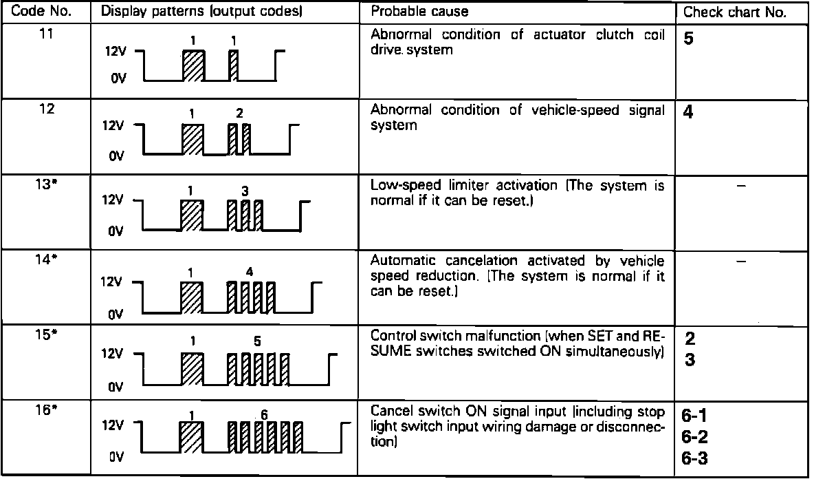 2. There are up to six cruise control related diagnostic codes, including one for normal condition. Check voltmeter readings with display patterns shown, then refer to the appropriate Circuit Tests. Fault codes indicated by an asterisk can be caused by an intermittent condition. Check related connectors and wiring circuits.