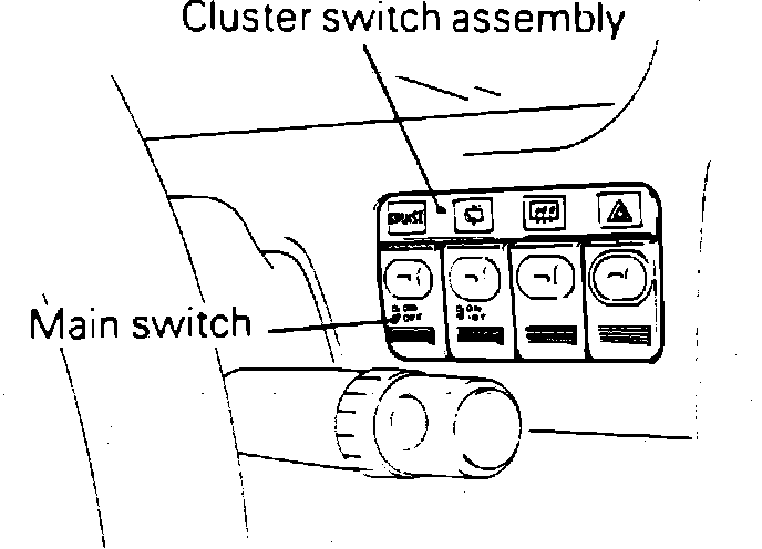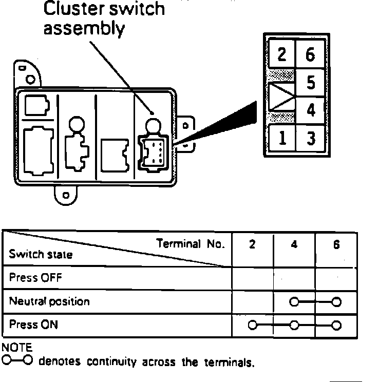 1. Remove main cluster switch. Operate switch and check continuity between terminals as shown.