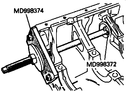 2. When installing left silent shaft rear bearing, apply clean engine oil to engine block bearing hole and to outer circumference of bearing. Using bearing installation tool No. MD998374 or equivalent, install bearing into cylinder block.