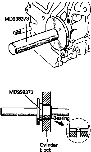 4. When installing silent shaft front bearing, apply clean engine oil to engine block bearing hole and to outer circumference of bearing. Using bearing installation tool No. MD998373 or equivalent, install bearing into cylinder block. Ensure oil hole in bearing is aligned with oil hole in cylinder block.