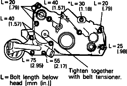 b. Install front case over top of guide, onto cylinder block. Temporarily tighten all bolts except the filter bracket attaching bolts, referring to bolt length chart.