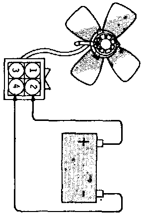 2. Ensure fan motor operates when battery voltage is applied to terminal 3 and terminal 4 is grounded.
