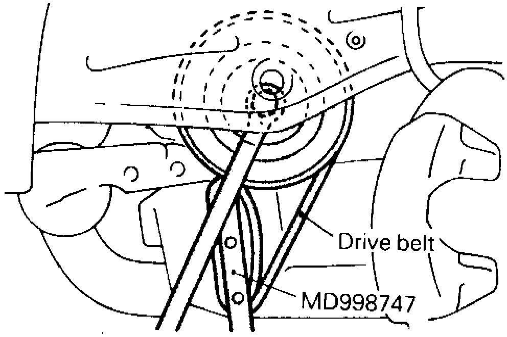 8. Using crankshaft pulley holder tool No. MD998747, or equivalent, and a discarded drive belt, stop rotation of crankshaft pulley, remove A/C and crankshaft pulley, Fig. 7.